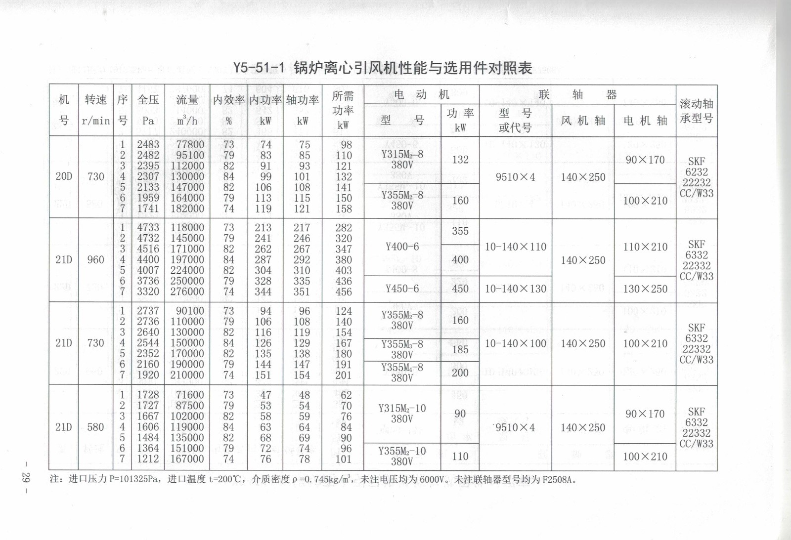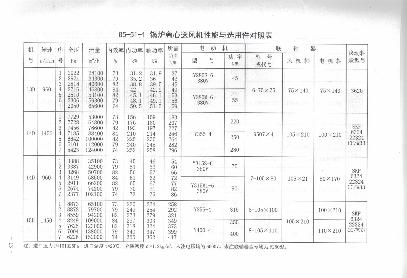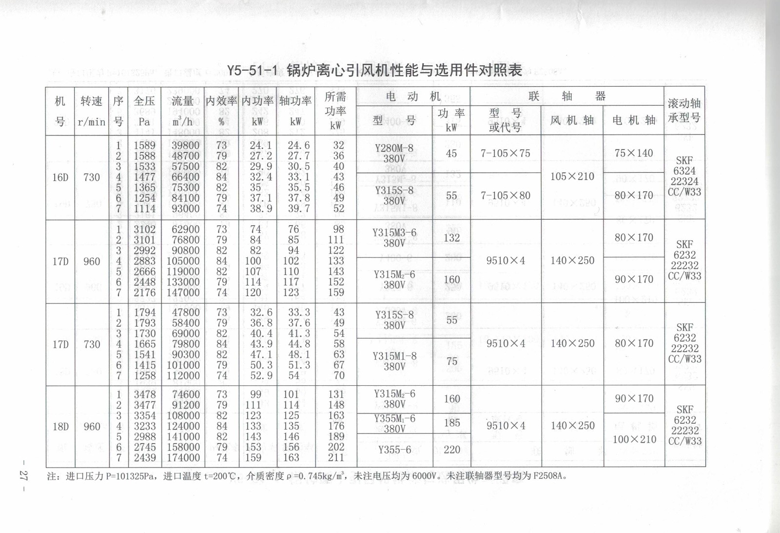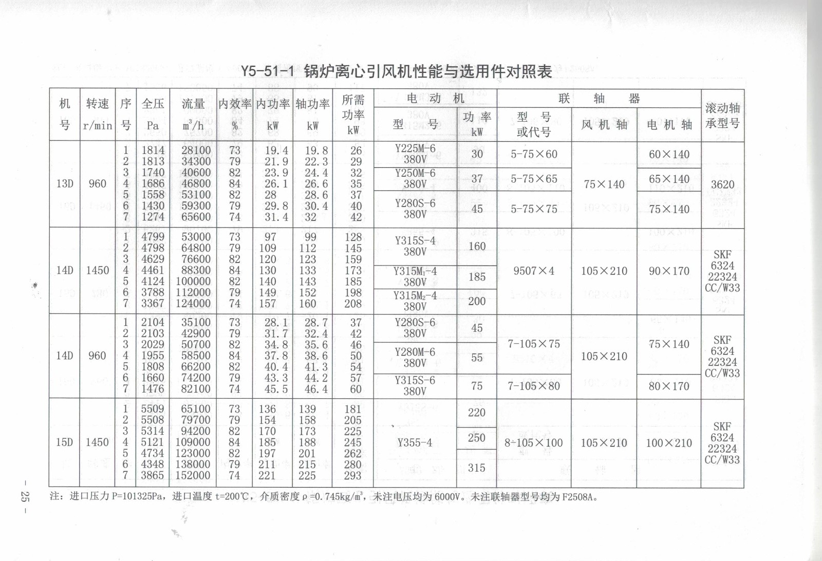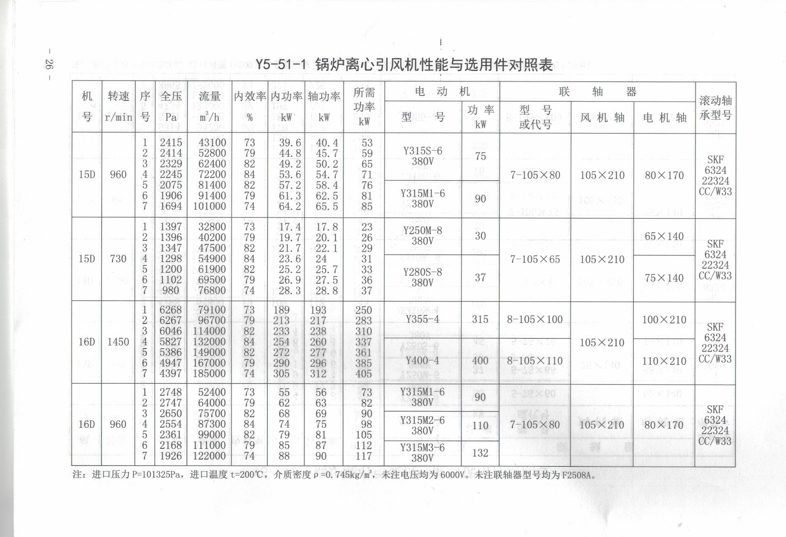 送風機輸送的介質為空氣,引風機輸送的介質為煙氣或含雜質顆粒之氣體。含雜質濃度小于200mg/m3時可用四年以上。如含雜質大也可使用,但使用壽命相對縮短。送引風機最高使用溫度不得超過250℃。性能參數條件:通風機進口壓力P=101325Pa,進口溫度t=200℃,介質密度ρ=0.745kg/m3。未注聯軸器型號均為F2508A。