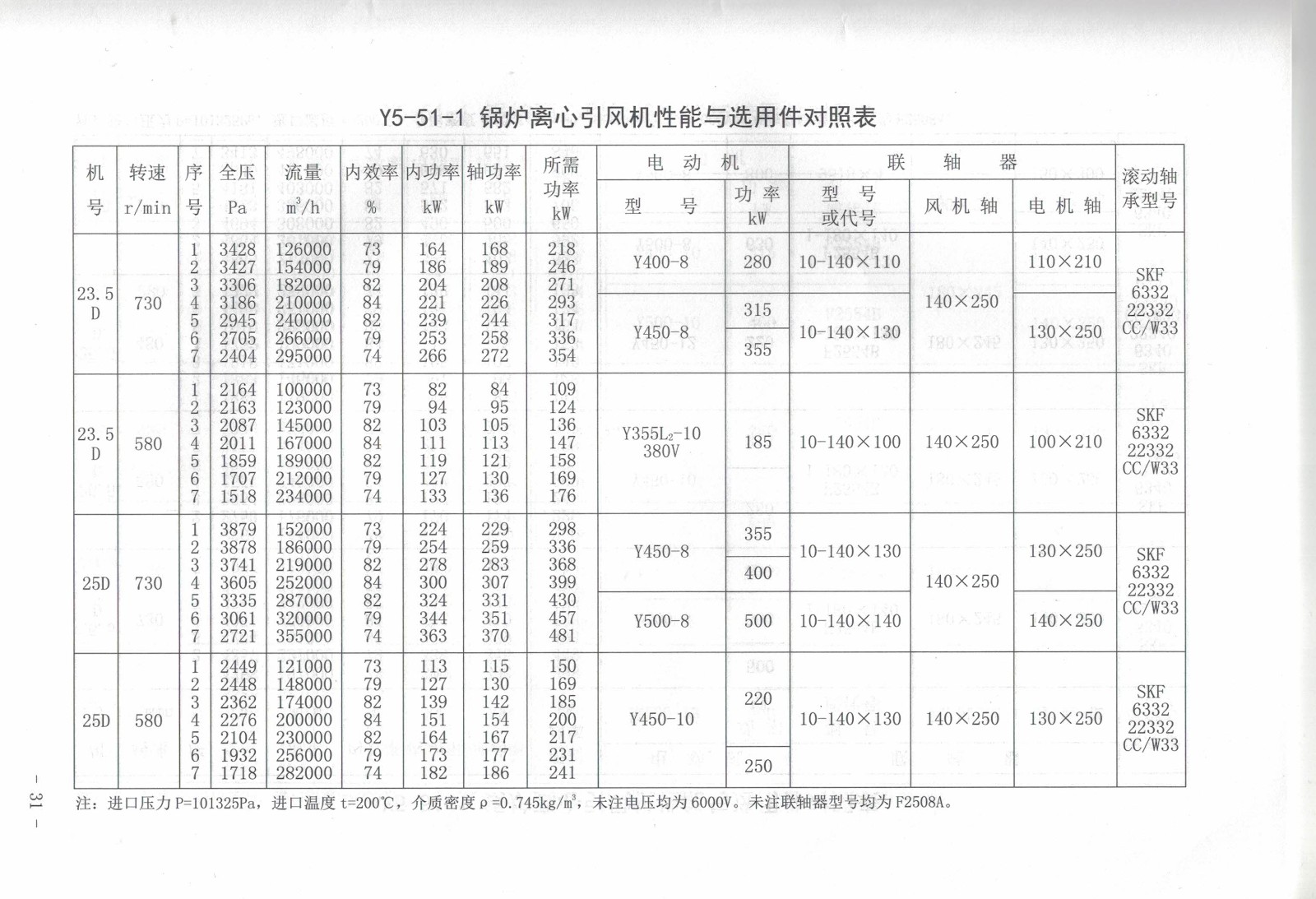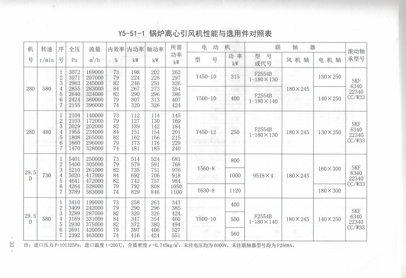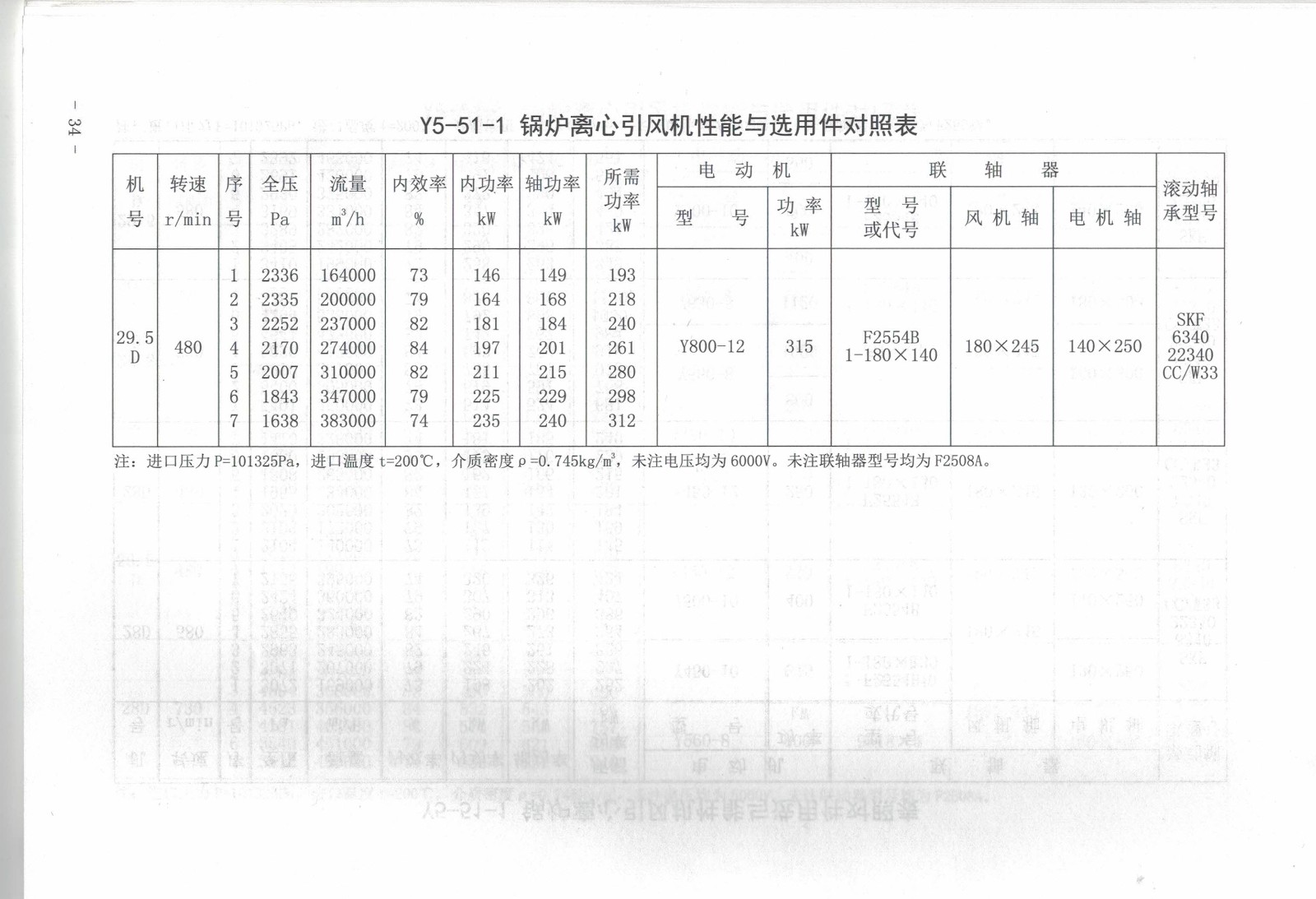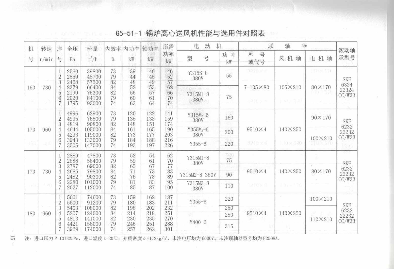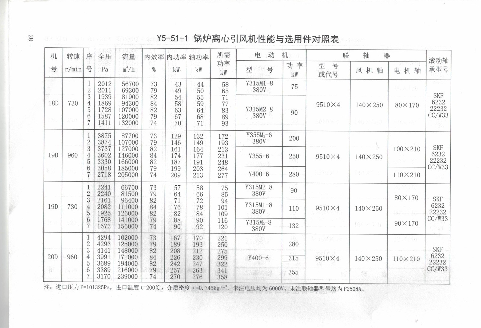 送風機輸送的介質為空氣,引風機輸送的介質為煙氣或含雜質顆粒之氣體。含雜質濃度小于200mg/m3時可用四年以上。如含雜質大也可使用,但使用壽命相對縮短。送引風機最高使用溫度不得超過250℃。性能參數條件:通風機進口壓力P=101325Pa,進口溫度t=200℃,介質密度ρ=0.745kg/m3。未注聯軸器型號均為F2508A。