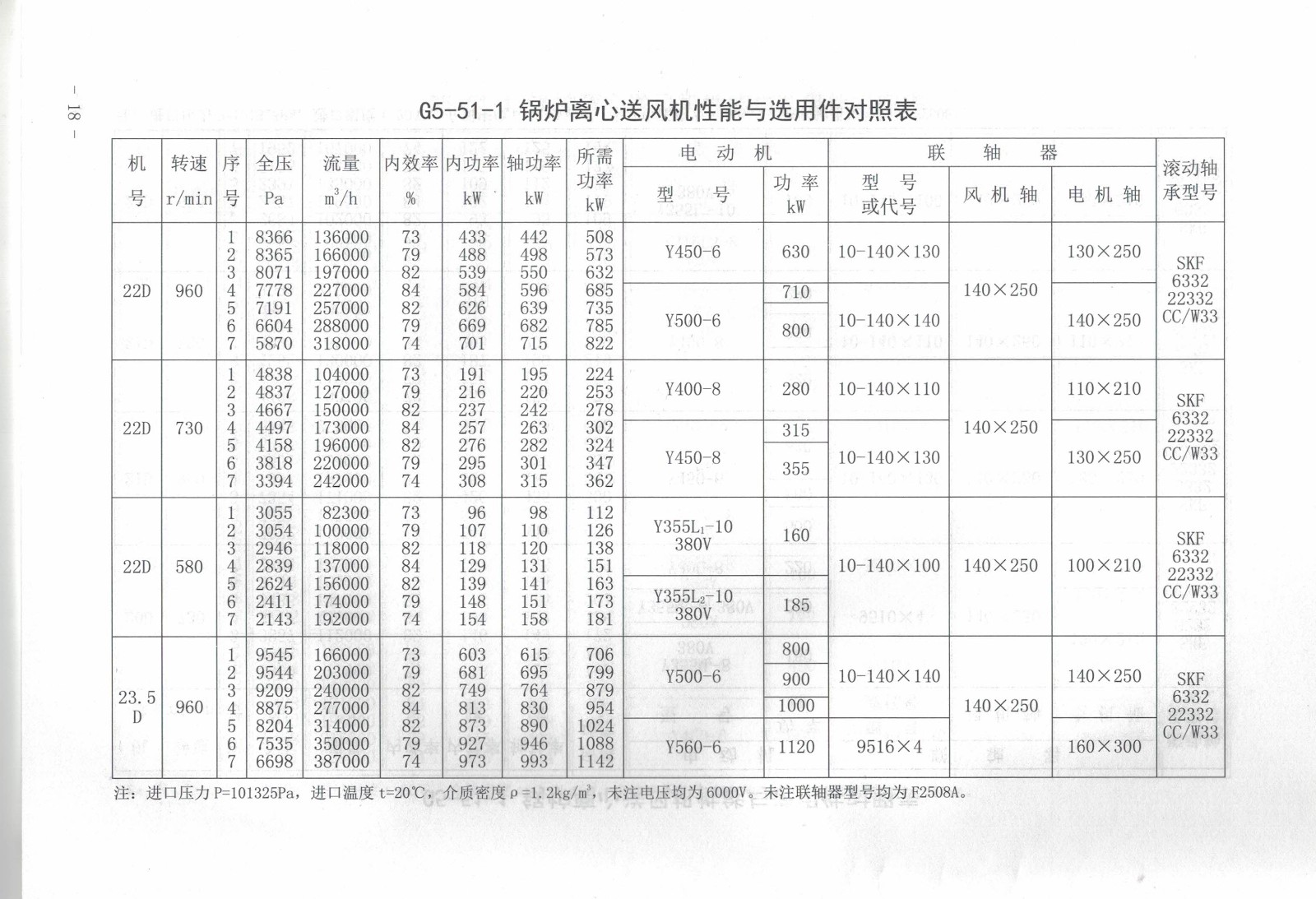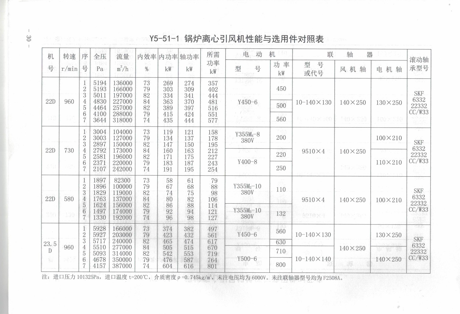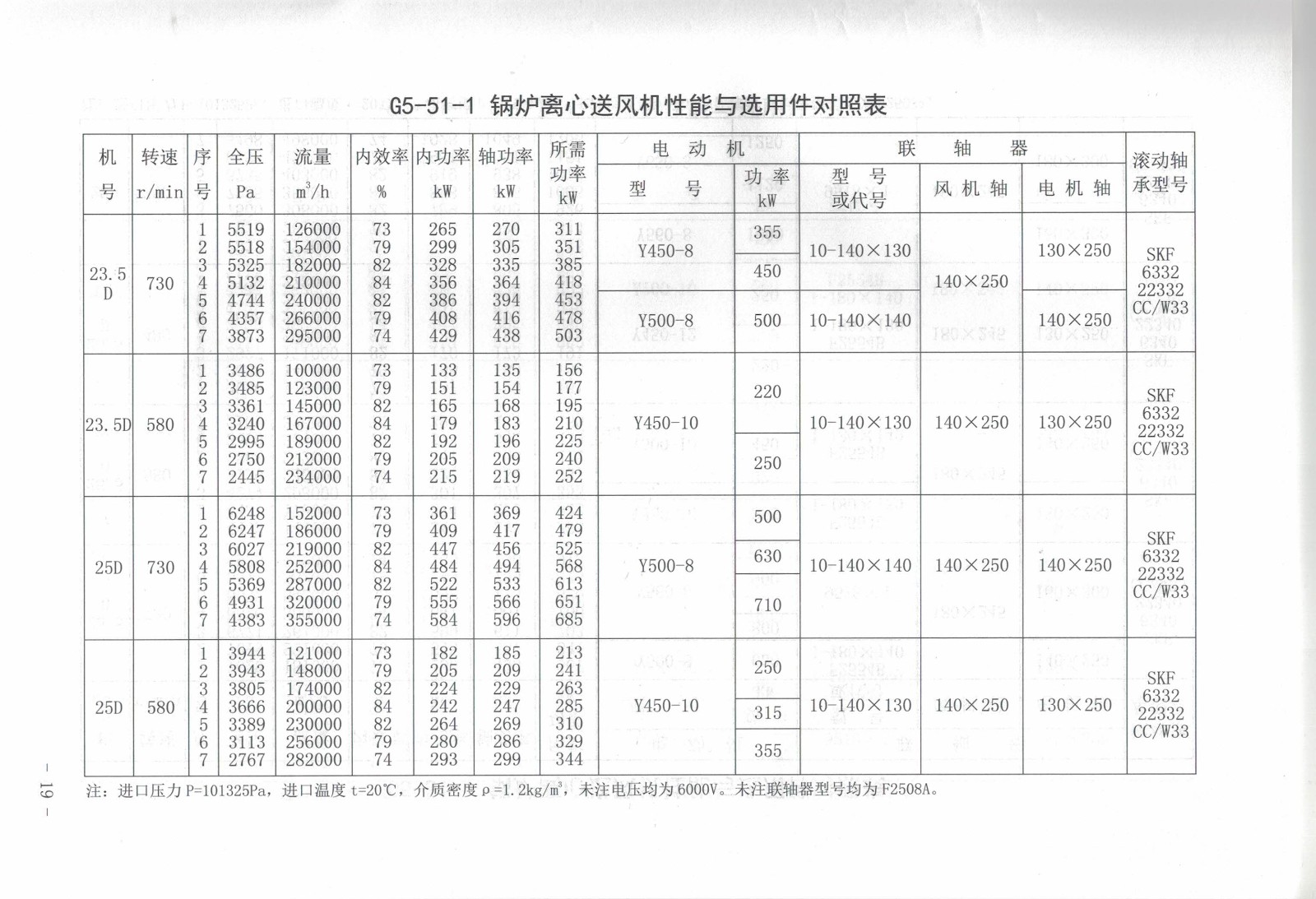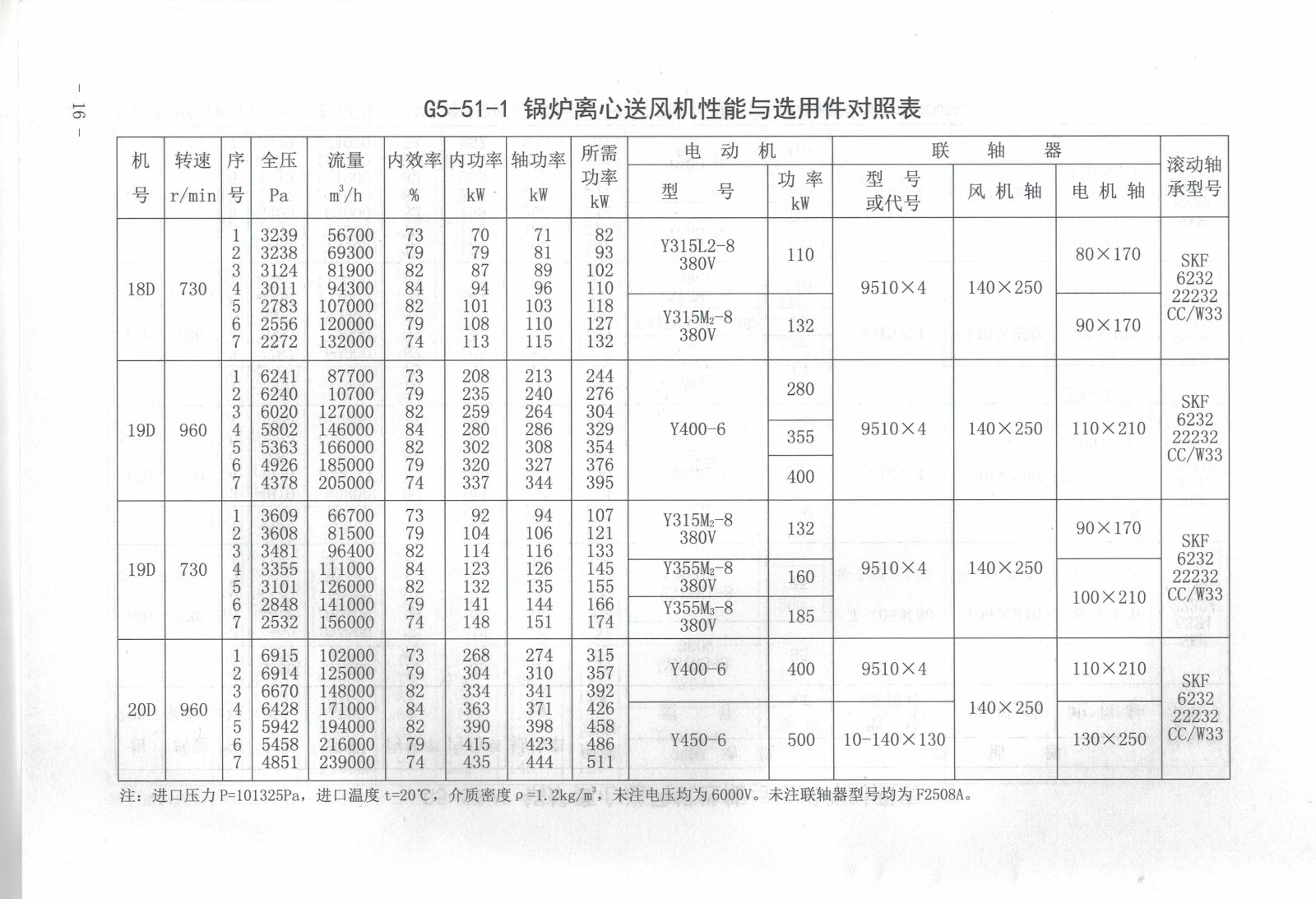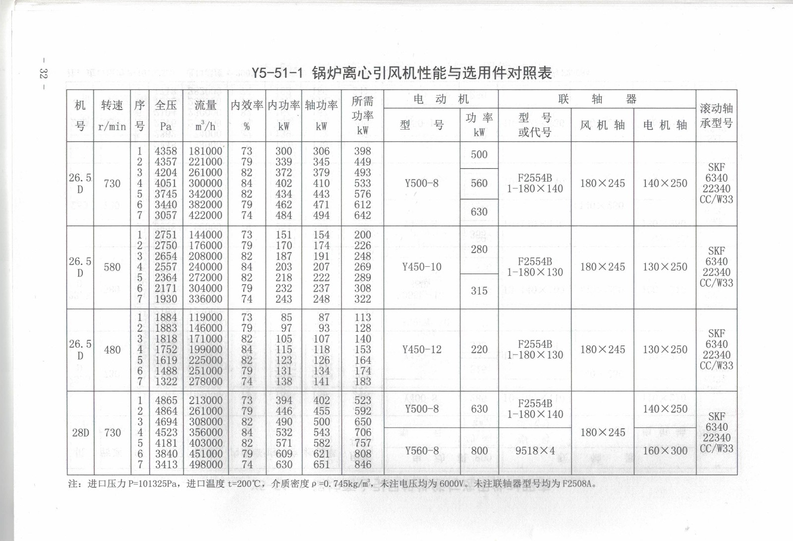 送風機輸送的介質為空氣,引風機輸送的介質為煙氣或含雜質顆粒之氣體。含雜質濃度小于200mg/m3時可用四年以上。如含雜質大也可使用,但使用壽命相對縮短。送引風機最高使用溫度不得超過250℃。性能參數條件:通風機進口壓力P=101325Pa,進口溫度t=200℃,介質密度ρ=0.745kg/m3。未注聯軸器型號均為F2508A。