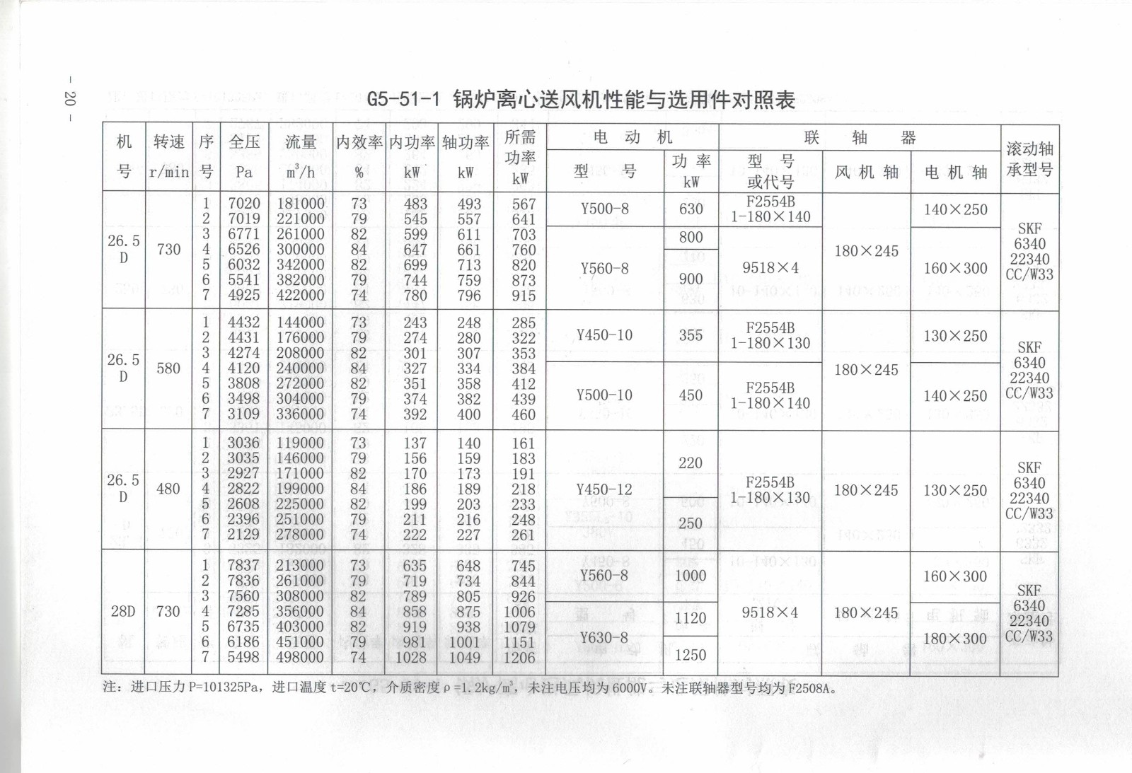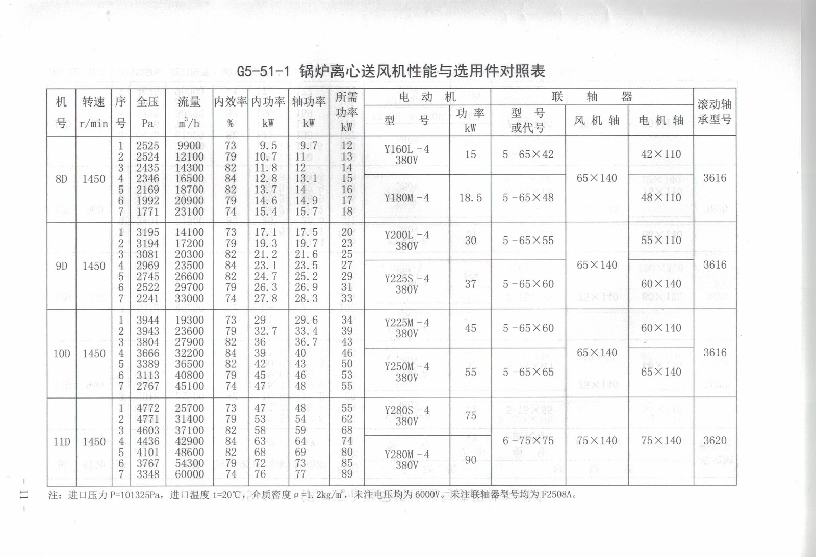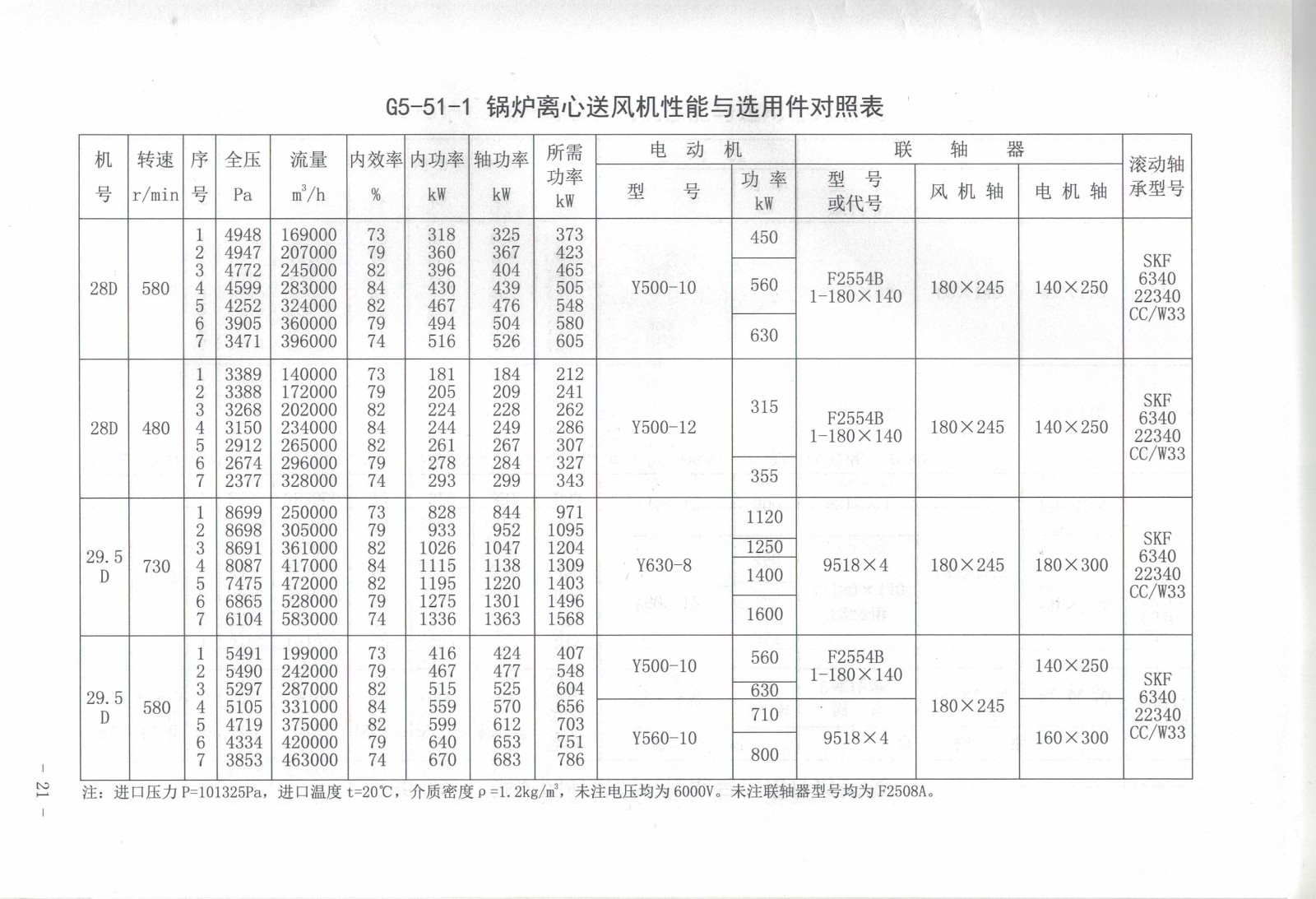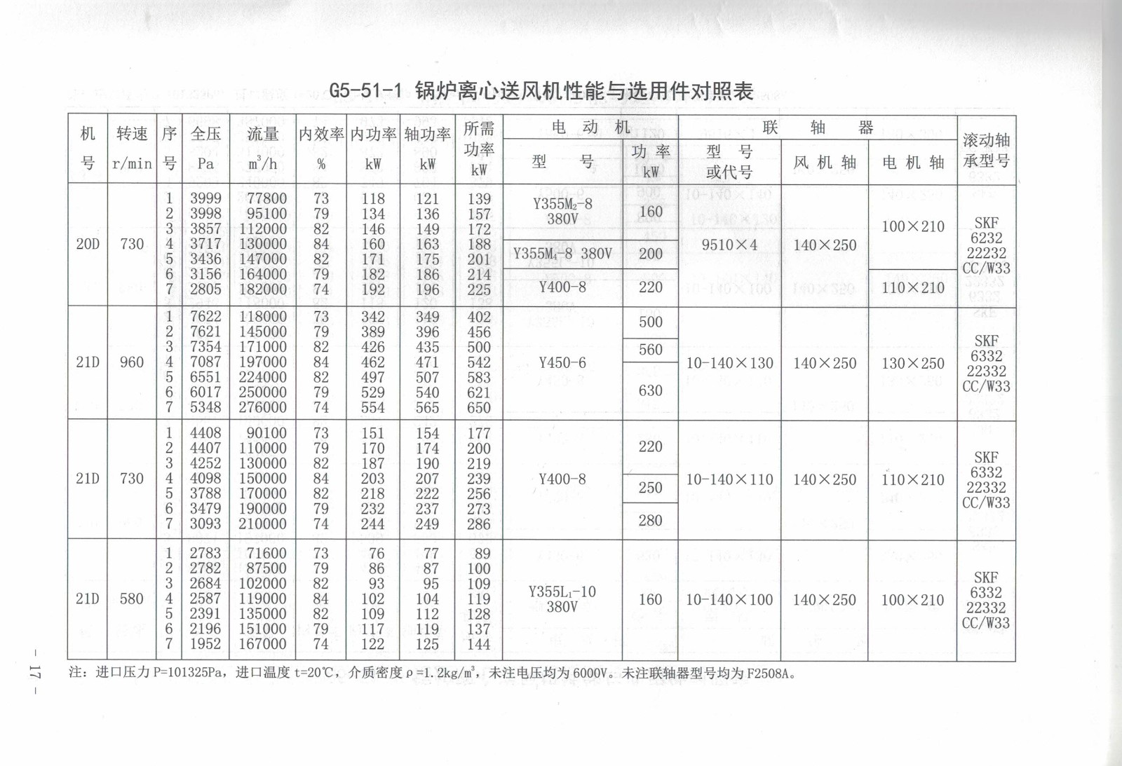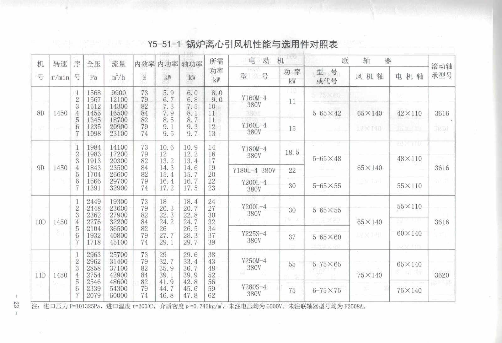 送風機輸送的介質為空氣,引風機輸送的介質為煙氣或含雜質顆粒之氣體。含雜質濃度小于200mg/m3時可用四年以上。如含雜質大也可使用,但使用壽命相對縮短。送引風機最高使用溫度不得超過250℃。性能參數條件:通風機進口壓力P=101325Pa,進口溫度t=200℃,介質密度ρ=0.745kg/m3。未注聯軸器型號均為F2508A。
