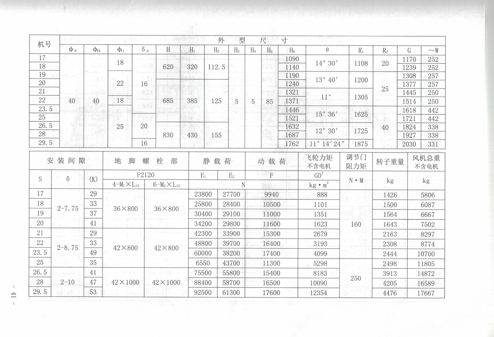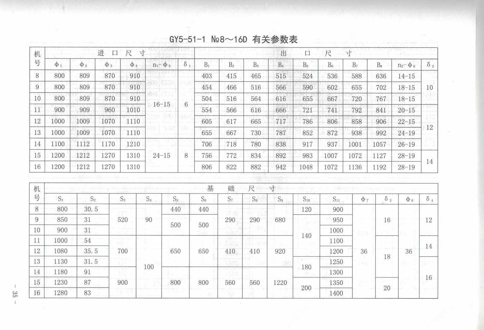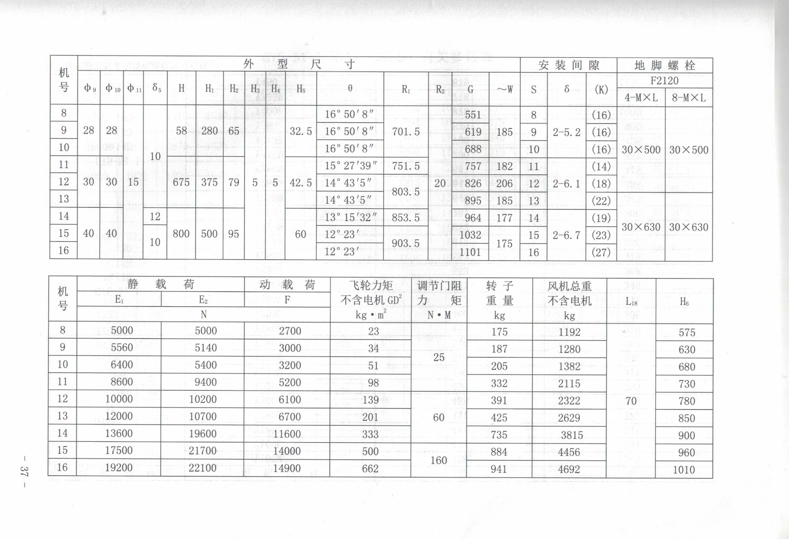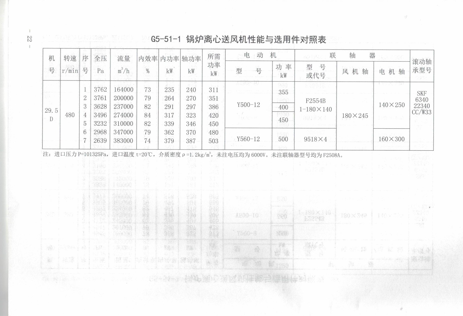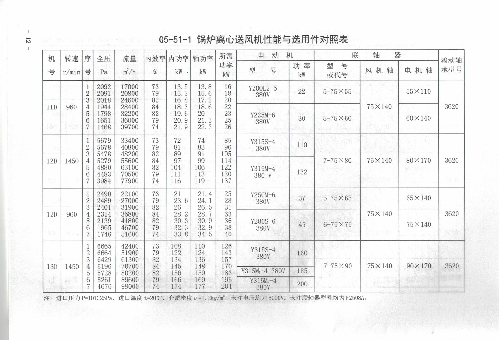 送風機輸送的介質為空氣,引風機輸送的介質為煙氣或含雜質顆粒之氣體。含雜質濃度小于200mg/m3時可用四年以上。如含雜質大也可使用,但使用壽命相對縮短。送引風機最高使用溫度不得超過250℃。性能參數條件:通風機進口壓力P=101325Pa,進口溫度t=200℃,介質密度ρ=0.745kg/m3。未注聯軸器型號均為F2508A。