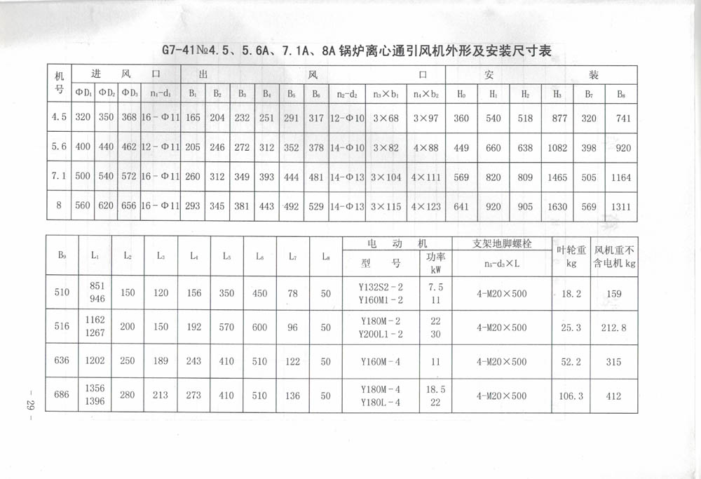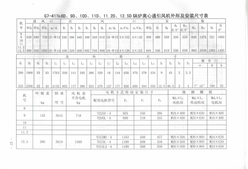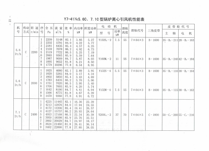 送風機輸送的介質為空氣,引風機輸送的介質為煙氣或含雜質顆粒之氣體。含雜質濃度小于200mg/m3時葉輪可用五年以上。如含雜質大也可使用,但使用壽命相對縮短。送引風機最高使用溫度不得超過250℃。性能參數條件:通風機進口壓力P=101325Pa,進口溫度t=20℃,介質密度ρ=1.2kg/m3;引風機進口壓力P=101325Pa,進口溫度t=140℃,介質密度ρ=0.85kg/m3。未注聯軸器型號均為F2508A。