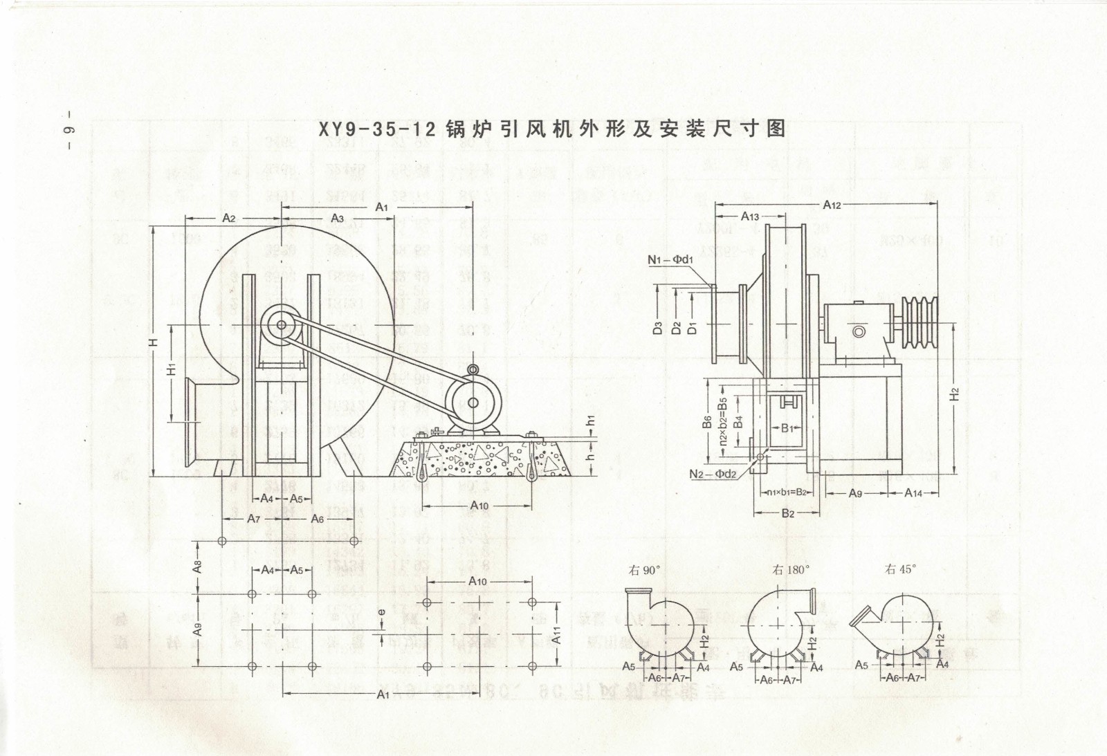 目前鍋爐系列較多,燃用煤質(zhì)差別較大,加裝除塵設(shè)備和余熱利用設(shè)備之后,產(chǎn)生抽力不足從而影響正常運(yùn)行,為了克服由上述原因所致抽力不足或爐膛出現(xiàn)正壓等影響鍋爐燃燒和正常運(yùn)行的現(xiàn)象,故設(shè)計(jì)制造了其風(fēng)量、風(fēng)壓與鍋爐相匹配的XY9-35鍋爐離心引風(fēng)機(jī)供用戶選用。其它性能相近者亦可選用。