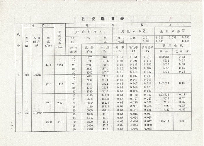 本風(fēng)機(jī)共有46個(gè)品種,其中3葉片、6葉片、8葉片和9葉片的有九個(gè)機(jī)號(hào),按葉輪直徑大小,由小到大的次序依次排列為: Na3、 3.5、 4、5、6、7、8、9、10;其中4葉片的共有十個(gè)機(jī)號(hào),按葉輪直徑的大小,由小到大的次序排列依次為: N2.5、3、3.5、4、5、6、7、8、9、10。